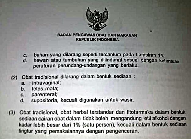 d. supositoria, kecuali untuk wasir (ket – dimasukkan ke dalam anus)Jadi, kalau ada produk obat tradisional yang dipromosikan dengan cara pakainya seperti di poin a-d itu, itu artinya, produsen atau distributor atau penjual sudah menyalahi aturan BPOM.