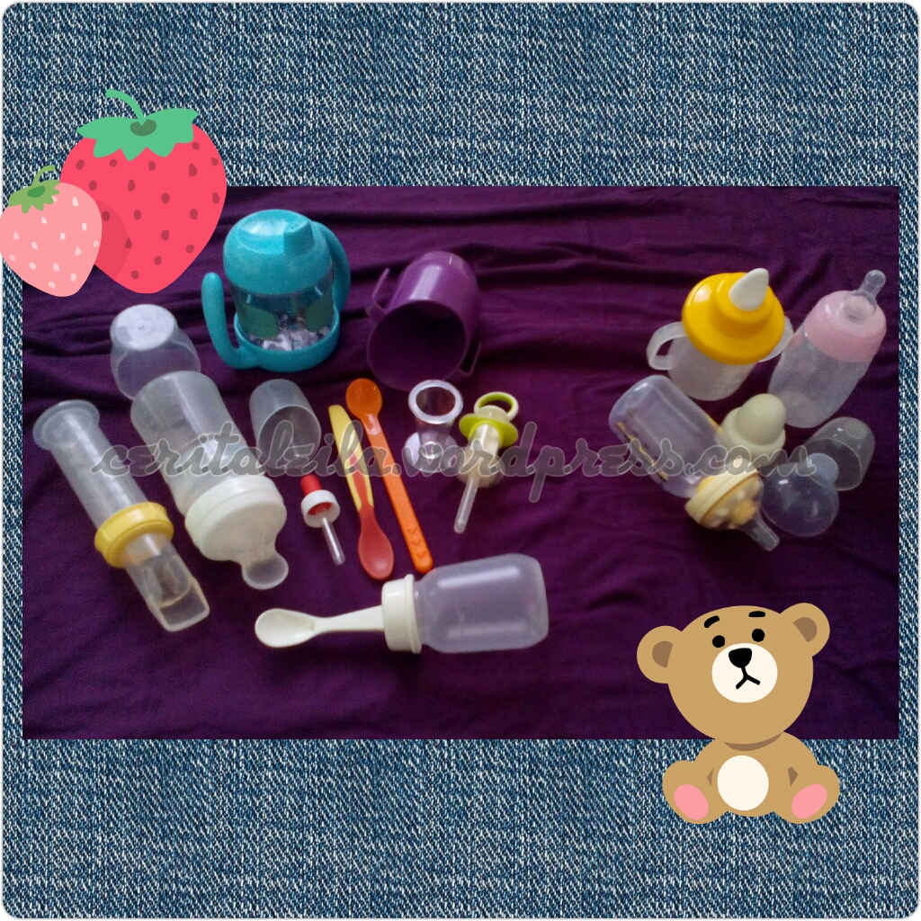 7. Sekali lagi, sabar dan semangat. Jika ibu menemui kesulitan, tidak ada salahnya minta tolong pihak yang kompeten seperti konselor laktasi untuk mengajari. Ini cara yang saya pakai, dan jadilah berbagai media seperti foto di atas (kecuali dot, yang itu sih dapat paketan dari breastpump yang saya beli lalu saya sembunyikan, hehehe) dicobakan oleh teman yang konselor laktasi AIMI. Bayi saya dan pengasuhnya dilatih di lantai bawah, saya mengungsi ke lantai dua rumah.