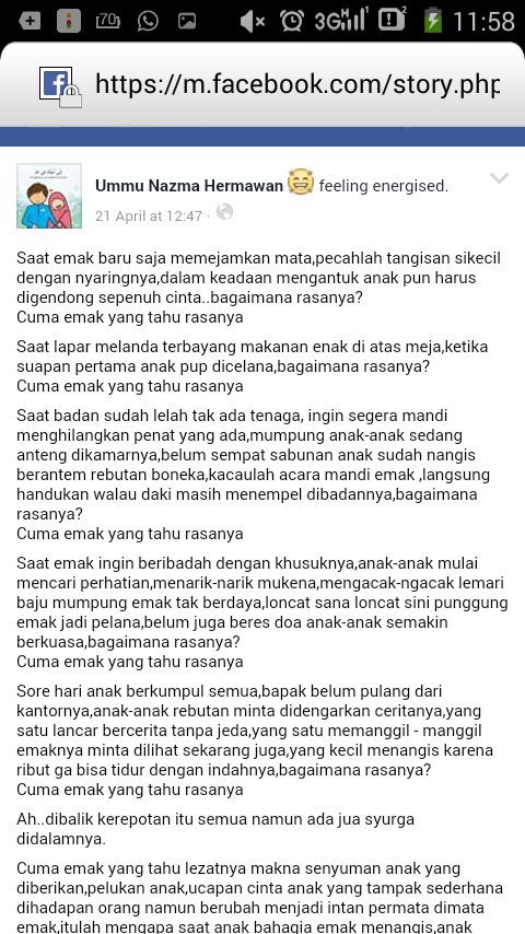 Cuma Emak yang tahu rasanya.Ah…di balik kerepotan itu semua, namun ada jua syurga di dalamnya.
