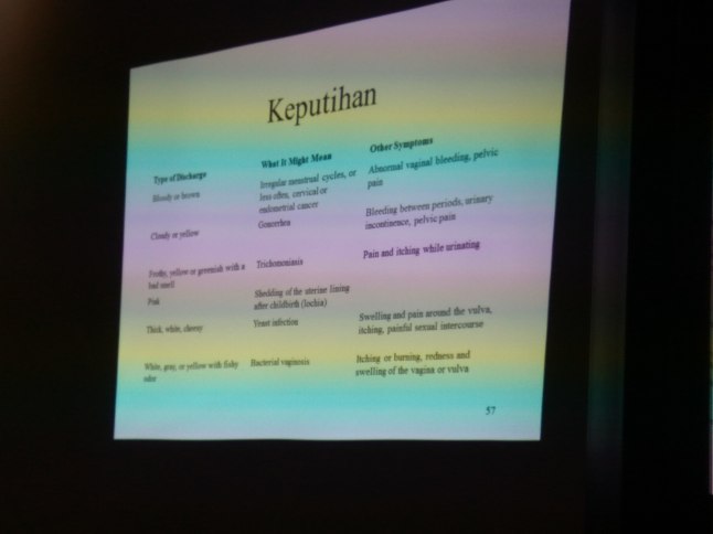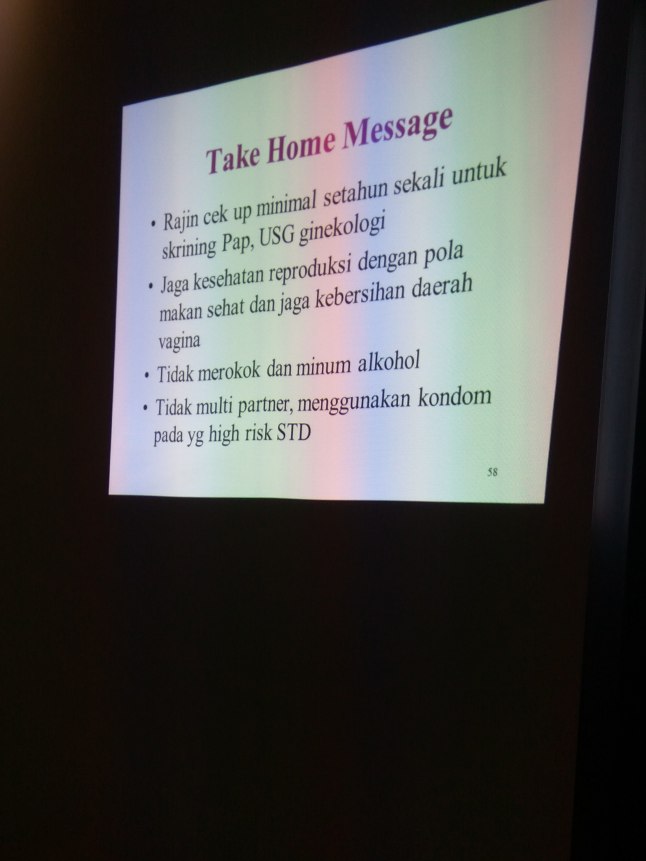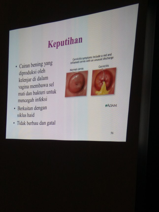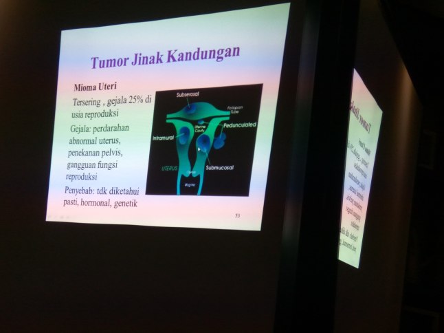Beranjak ke materi utama, dr. Riyana mempresentasikan mengenai kanker leher rahim. Penyebab kanker leher rahim sendiri bermacam-macam dan sebagian belum sepenuhnya diketahui. Human papillomavirus atau HPV yang menjadi penyebab utama kanker leher rahim (atau dalam bentuk lebih jinak bisa mewujudkan diri dalam bentuk kutil kelamin) 70% bisa sembuh sendiri karena virus kan pada dasarnya self limiting disease. Sedangkan yang 30% bisa berkembang misalnya karena pengaruh lingkungan. Menikah dan hamil terlalu muda, pola makan yang tidak baik, stres (yang biasanya berdampak juga ke makan sembarangan dan istirahat ikut terabaikan), berganti pasangan/partner seksual, merokok, banyak melahirkan, merokok bisa memicu perkembangan kanker. Kanker leher rahim ini lebih sering terlambat dideteksi. Segala kelainan di organ kewanitaan kita bisa menyebabkan keluhan di area berkemih maupun anus, jadi waspada terhadap gejala yang kita alami atau rasakan, misalnya sering berkemih ataupun keputihan berlebihan. Keputihan ada yang normal ada yang tidak. Yang jelas perlu waspada kalau ada perubahan pola haid, keputihan disertai darah. Keputihan bisa pengaruh ke kesuburan kalau sampai naik ke panggul dan menyumbat saluran tuba misalnya. Tapi tidak bisa langsung disimpulkan sulit punya anak karena keputihan karena ada banyak faktor.