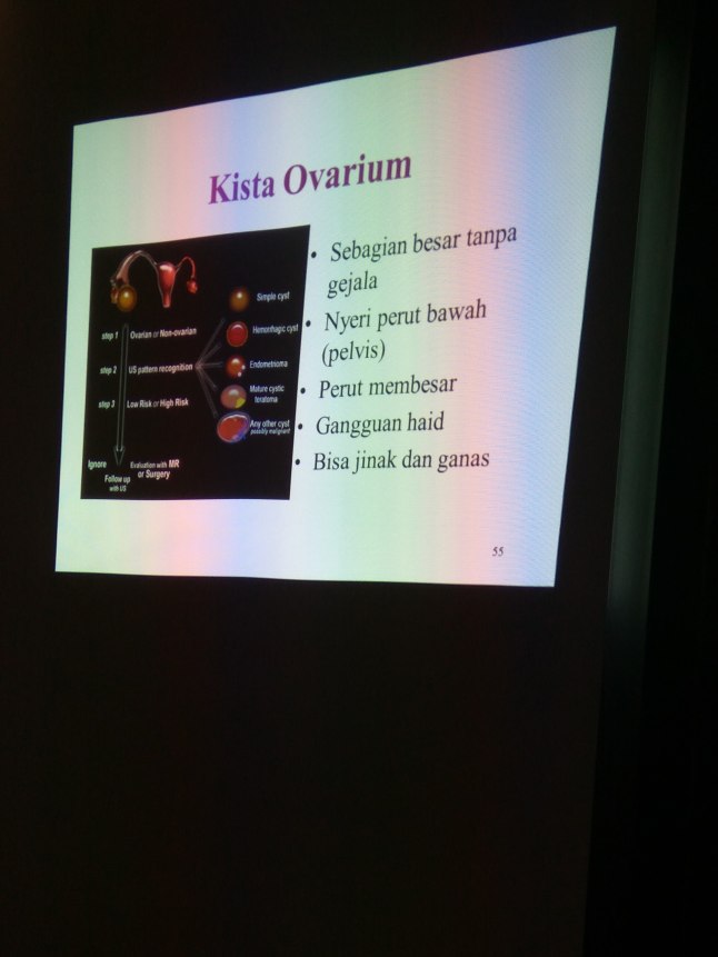 Apa bedanya kanker dengan tumor? Tumor itu artinya benjolan, sifatnya lokal, belum tentu membahayakan. Bisa jinak bisa ganas. Yang membesar dan sel bertambah itu neoplasma. Kista itu benjolan berisi cairan, min. isinya 30cc. Bening, dindingnya tipis, simple cyst bisa sembuh sendiri. Kista fisiologis saat hamil berisi lutein, nanti bisa hilang sendiri, dia justru mendukung bayi dengan hormon. Yang ganas dan menyebar, baru namanya kanker. Proses karsinogenetik pencetusnya bisa virus, makanan, zat berbahaya yang nempel dan merusak kerja sel entah menghambat pertumbuhan atau menghambat sel yang mematikan. Kanker sudah menembus sel, kalau prakanker belum. Sebetulnya kalau bisa ditangani dini lebih baik agar bisa dibuang. Kanker ovarium ada kaitan dengan genetik, termasuk kanker payudara dan kanker usus. Di luar negeri bisa tindakan pencegahan dengan masektomi misalnya yang dilakukan oleh Angelina Jolie.