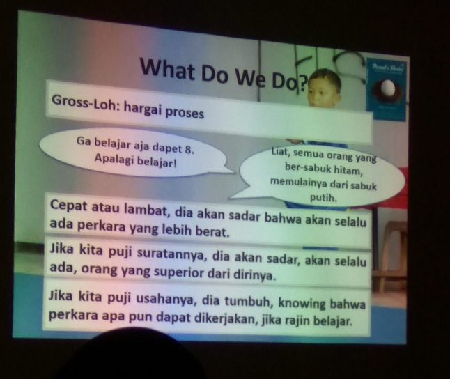 Sebaliknya, dalam rangka menjaga ego anak juga kita perlu memilah kata dalam mengkritik, misalnya “This is ok, you can do better, let’s practice more.” kalau gambarnya menurut kita masih belum bagus. Sesuaikan ekspektasi kita, contohnya kalau lego kan terbatas, wajar kalau anak mengkreasikan sesuatu tidak terlalu mirip dengan bentuk aslinya, beda dengan gambar. Kalau mau membandingkan kemampuan anak dengan anak lain, bandingkan dengan populasi (biasanya anak punya gengsi di situ), bingkai dengan positif. Jangan bandingkan dengan individu lain atau tunjuk anak lain misalnya temannya, “Lihat tuh si itu bisa….”.