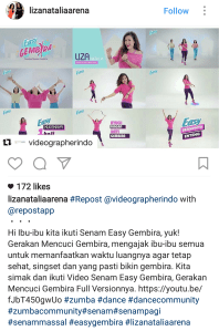 Kampanyenya sendiri disebut dengan nama Easy Gerakan Mencuci Gembira atau “Easy Gembira”. Diharapkan, kampanye ini bisa menginspirasi para wanita agar dapat memanfaatkan waktu luang dengan menikmati kegiatan olahraga yang menyenangkan seperti senam Easy Gembira, yang gerakannya fun, easy, dan impactful. Saya sudah mengintip gerakan senamnya yang diunggah di YouTube dan ada pula cuplikannya yang dimuat di instagram sebagai acuan bagi yang ingin berlatih, gerakannya terbilang tidak sulit diikuti tapi cukup untuk mengajak para ibu bergerak aktif. Lagunya yang ceria pun mudah dingat. Model dalam video acuan tersebut adalah artis dan instruktur senam profesional Liza Natalia, yang terkenal dengan gerakan senamnya nan energik. Menurut mba Liza, senam sudah jadi salah satu olahraga yang dapat dilakukan oleh wanita dengan mudah dan memiliki banyak manfaat, seperti menjaga metabolisme tubuh dan meningkatkan stamina.