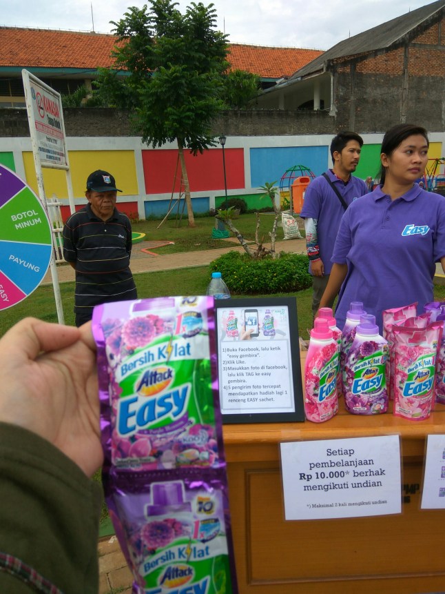 Selain kegiatan senam, di lokasi yang sama Easy juga mendirikan booth yang memberi penawaran bonus untuk setiap pembelian produk Easy, juga ada lho hadiah untuk yang mengunggah aktivitas kampanye tersebut di media sosial. Lumayan lho, dapat satu renceng deterjen cair Easy :).