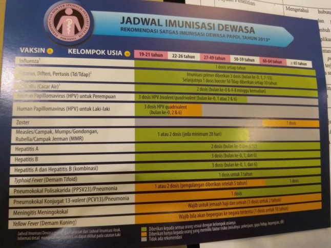Berikutnya, dr. Innes Ericca mengajak belajar tentang Vaksinasi pada Dewasa dan Lansia. Ada beberapa vaksin yang disarankan oleh PAPDI (Perhimpunan Dokter Spesialis Penyakit Dalam Indonesia) sebagaimana tergambar dalam jadwal berikut ini: