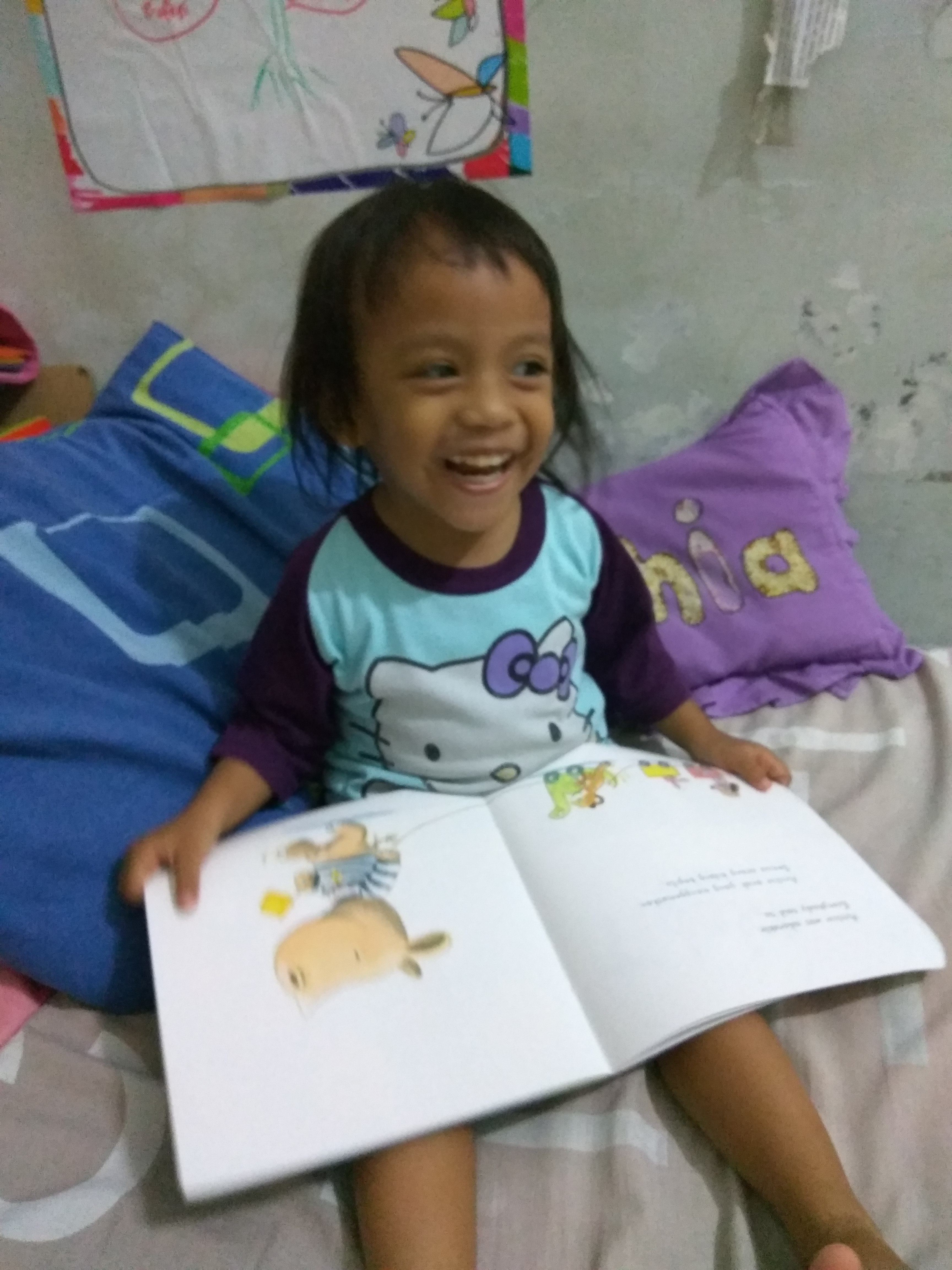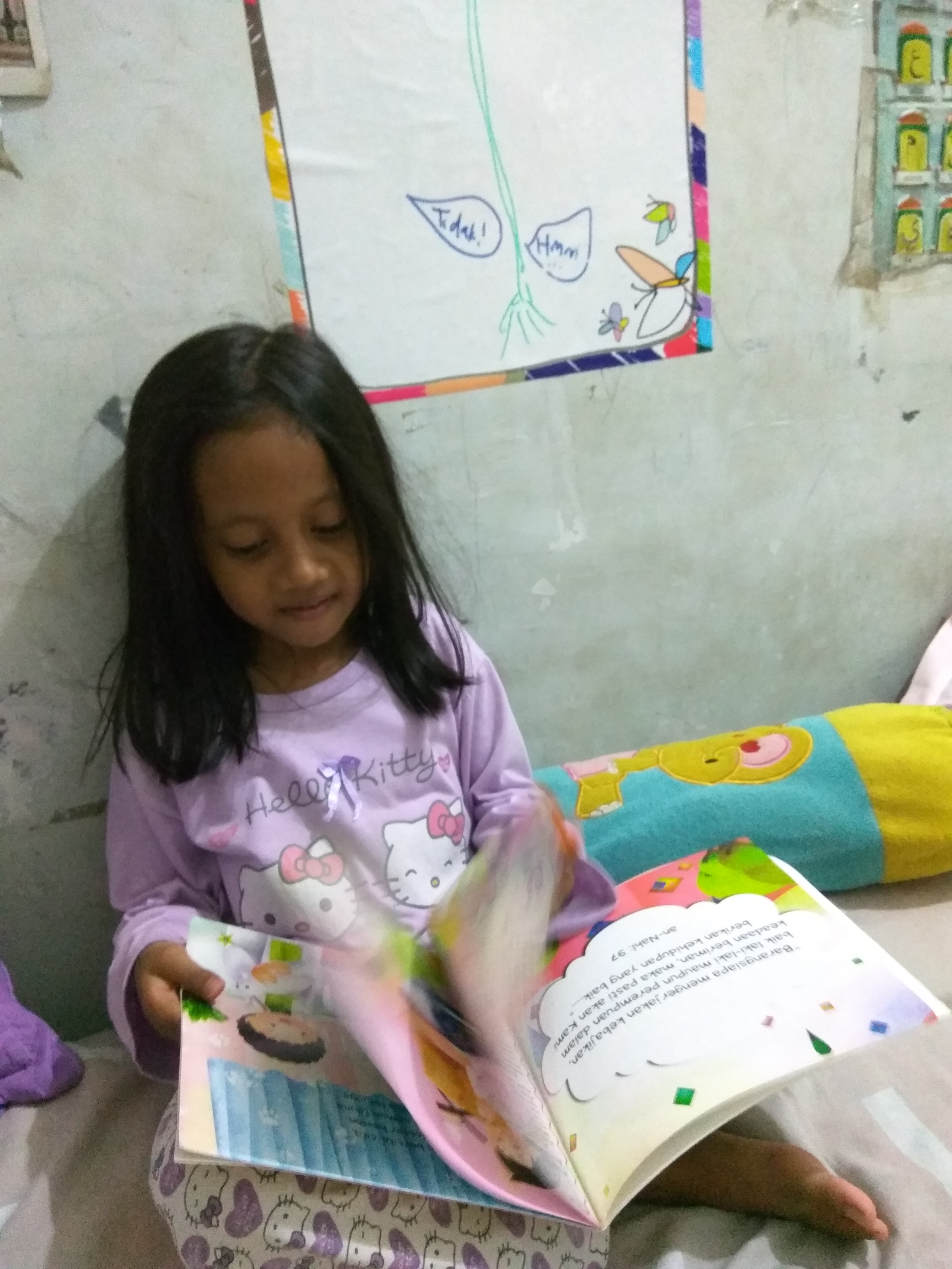 Fahira (2 tahun 6 bulan) melihat-lihat dan dibacakan buku bilingual Tidak! (No!, Erlangga for Kids). Hanya saya bacakan bahasa Indonesianya sih, kadang bahasa Inggris-nya saya bacakan cuma untuk menggoda kakak yang adakalanya tertarik tapi lebih sering menolak mendengar saya membaca dalam bahasa Inggris kalau bukunya bilingual.