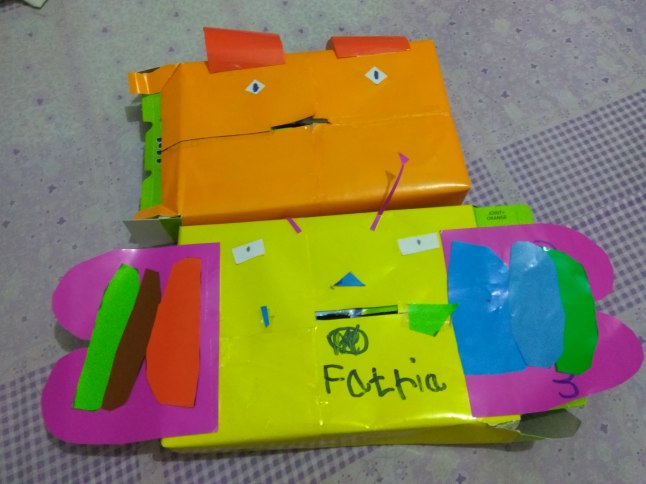 Di antara waktu itu, saya bermaksud melanjutkan sesi ‘kasih makan kelinci dan kupu-kupu’ kemarin. Sambil menyuapi celengan berbentuk hewan yang mereka buat beberapa waktu yang lalu itu dengan uang logam, kami bertiga (Fahira walaupun demam tapi masih tetap semangat). Obrolan kami berlanjut ke konsep rezeki. Uang yang ditabung itu dari mana sih asalnya? Mungkin yang kasih bunda atau ayah, tapi asalnya tetap dari Allah. Allah yang memberi rezeki, ada yang berupa uang, kesehatan, kesempatan…. Fathia sempat bertanya siapa yang membuat uang, jadi saya terangkan bahwa Allah yang membuat manusia jadi berilmu dan bisa mencetak uang. Dulu orang memakai sistem barter, tapi agar lebih memudahkan dan menyamakan nilai maka dibuatlah mata uang. Mata uang ini bisa berbeda-beda di tiap negara.