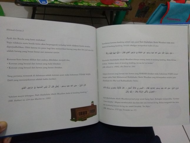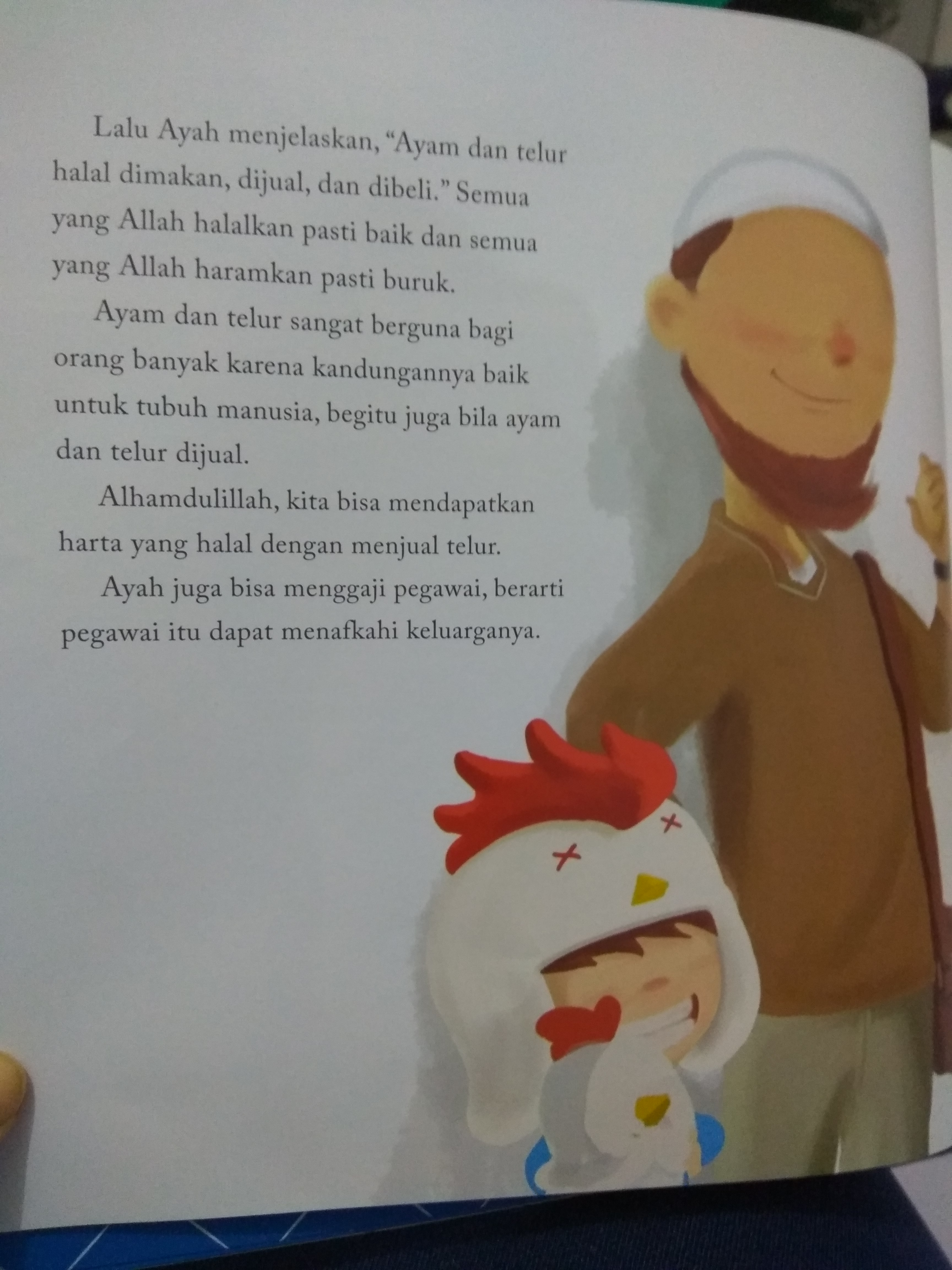 Cerita pertama dalam buku ini membahas bahwa ayah Zaid punya usaha peternakan ayam untuk diambil telurnya. Dari situ bergulir percakapan antara Zaid dan ayahnya, apa nggak kasihan ayam dipisahkan dari telurnya? Ayah Zaid menjelaskan bahwa telur ayam halal, banyak manfaat, dan juga tidak ada larangan jual beli telur ayam ini. Dengan menjual telur ayam, keluarga Zaid bisa memperoleh uang untuk kebutuhan hidup, juga bisa mempekerjakan pegawai, sehingga pegawai tersebut juga memperoleh gaji untuk keluarganya. Saya menyambungkan cerita ini dengan mata pencaharian eyang anak-anak (mertua) yang berjualan ayam potong di pasar.