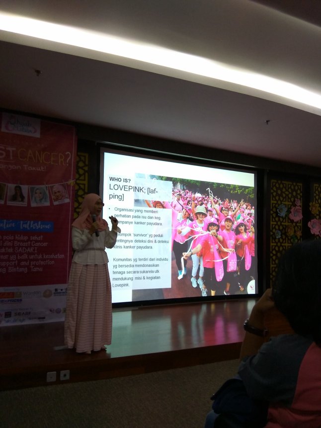 Salah satu yang mengisi sharing session dalam acara tersebut adalah bu Ina Sumantri, penyintas (survivor) kanker payudara yang kemudian menjadi penggiat komunitas Love Pink. Tahun 2013, beliau terdiagnosa stadium 2 tahun dan sudah menjalani rangkaian pengobatan termasuk kemoterapi dan radiasi.