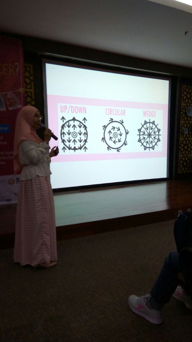 Ibu Ina juga menjelaskan, sebetulnya siapa saja yang berisiko? Selain itu diperagakan pula Gerakan untuk Sadari (Periksa Payudara Sendiri) yang diikuti oleh seluruh peserta).