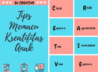 Setiap anak terlahir kreatif, tugas kitalah sebagai orangtua untuk merawat serta memacu kreativitas mereka. Bagaimana caranya? Berikut adalah beberapa tips bagi orangtua untuk memacu kreativitas anak yang terangkum dalam kata CREATIVE.