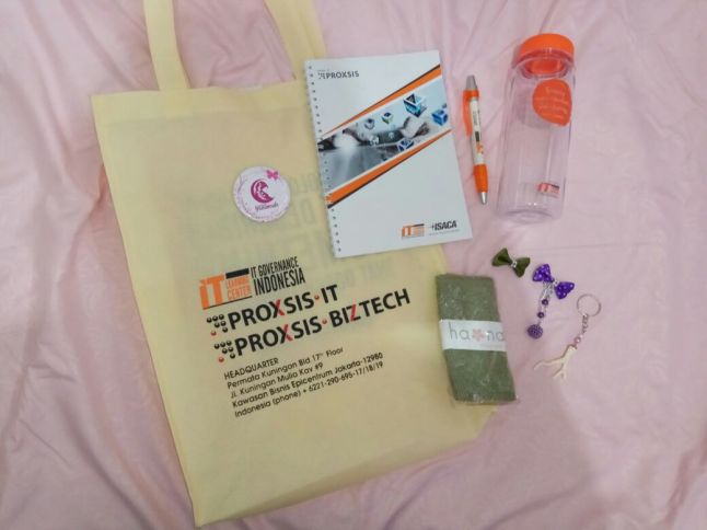 Seluruh peserta yang hadir juga mendapatkan goodie bag saat registrasi. Isinya? Buku tentang bijak bermedia sosial terbitan Kementerian Komunikasi dan Informatika, pin Blogger Muslimah, bandana rajut dari Hana Mozlima, bros dan gantungan kunci, paket pernak-pernik Proxsis (tas, notebook, bolpoin, tempat minum), daaann gamis Seply!