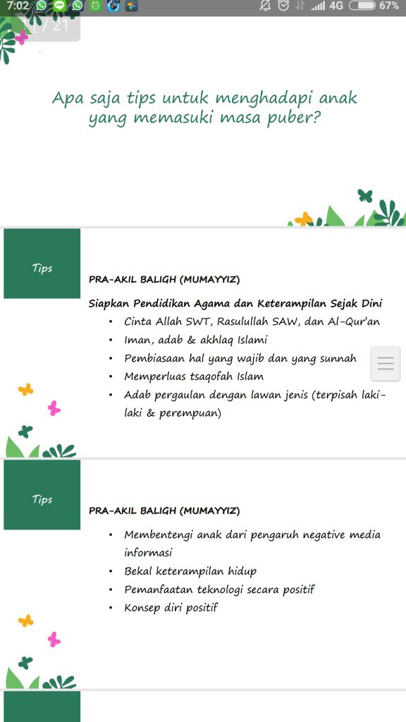 Berupa menjaga kebersihan tubuh, cara bersuci dari hadats kecil dan besar (mandi wajib), menjaga konsumsi makanan yang baik dan meminta anak untuk tidak sungkan bertanya bila mereka mengalami perubahan tubuh yang terasa berbeda.