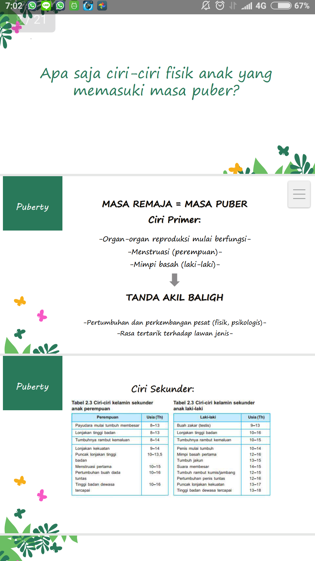 Ciri sekunder dapat dilihat pada tabel di dalam slide. Sedangkan secara psikologis, perubahan ditandai dengan adanya ketertarikan terhadap lawan jenis.