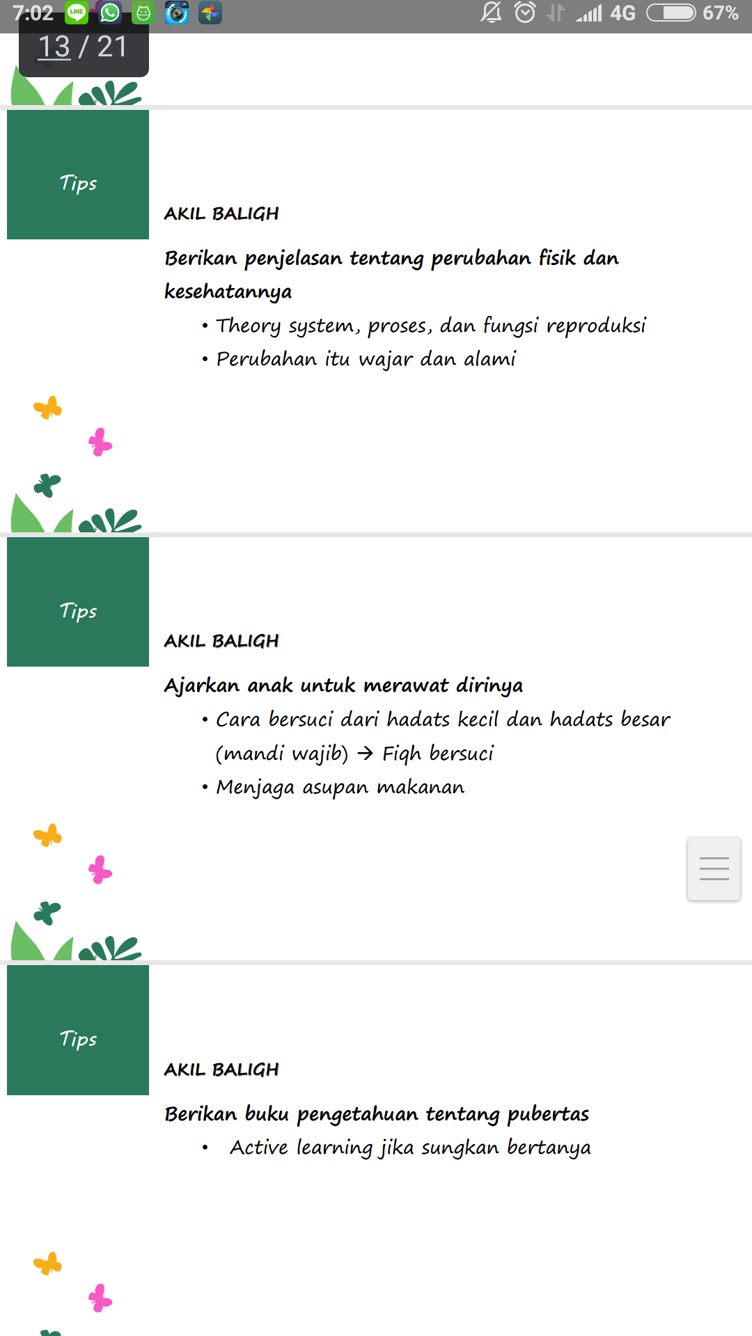 Berupa menjaga kebersihan tubuh, cara bersuci dari hadats kecil dan besar (mandi wajib), menjaga konsumsi makanan yang baik dan meminta anak untuk tidak sungkan bertanya bila mereka mengalami perubahan tubuh yang terasa berbeda.