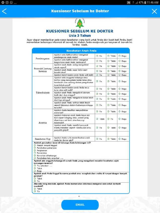 Menu kuesioner kunjungan ke dokter sangat membantu karena biasanya ketika ke dokter orangtua malah jadi blank ya, bingung apa yang mau ditanyakan dan diceritakan, sementara anak juga rewel, padahal dari cerita orangtualah dokter bisa menggali sebab musabab dan proses perjalanan penyakit atau cidera yang dialami, dan bisa mengarahkan ke penanganan yang lebih tepat.