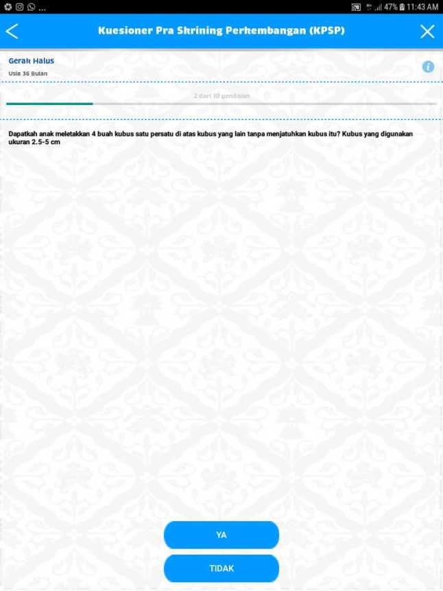 Di bagian bawah ada menu Skrining yang berisi pertanyaan seputar medis (apakah anak sering sesak napas, mudah lelah, apakah orangtua kesulitan menyediakan makanan bergizi, apakah orangtua punya kekhawatiran tertentu) maupun perkembangan yang berupa Kuesioner Praskrining Perkembangan Anak (KPSP).