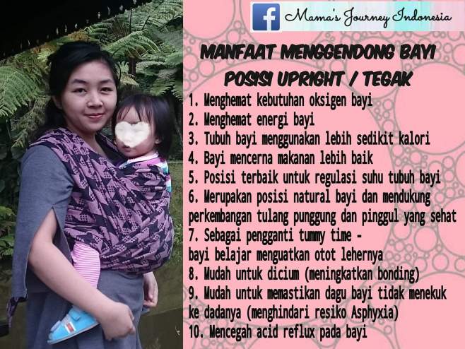 Seperti sudah pernah saya ceritakan dulu, sejak tahun kemarin saya bergabung dalam grup fb (kemudian whatsapp) komunitas menggendong yang bernama Indonesian Babywearers. Dari situ saya belajar banyak. Salah satu admin yang rajin mem-post konten edukasi adalah mba Inggrid Damayanty Thomas. Melalui IBW maupun fb page-nya, Mama’s Journey, Mba Inggrid yang berdomisili di Bali ini banyak memberikan pencerahan soal menggendong bayi yang baik, aman, dan nyaman untuk yang digendong maupun penggendong. Tentu yang dibagikan adalah info tepercaya, karena mba Inggrid sudah mengantongi sertifikat Babywearing Consultant dari School of Babywearing UK.