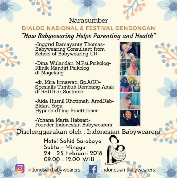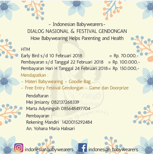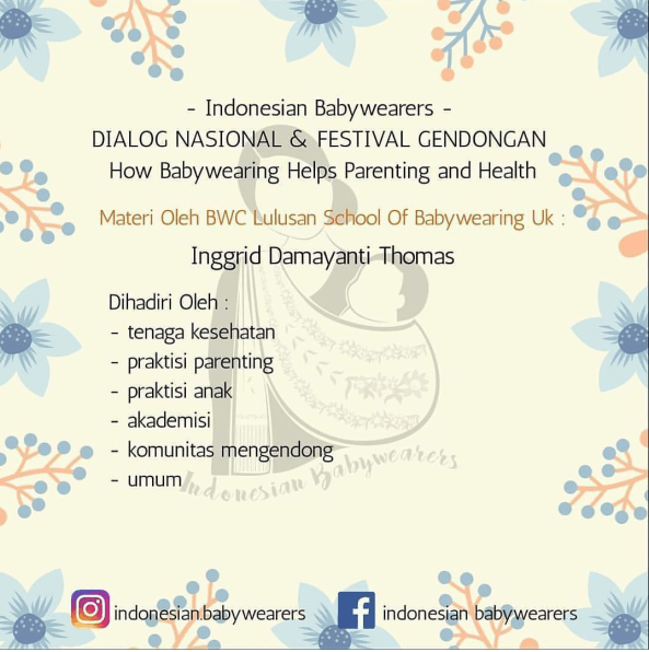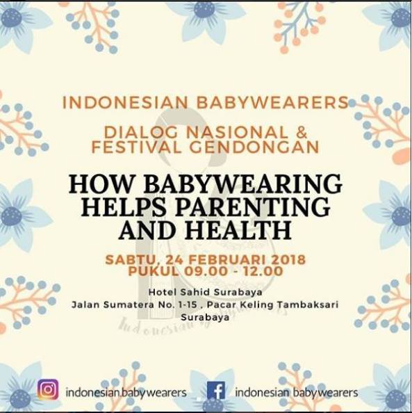 Untuk menggali lebih lanjut mengenai gendongan ini, Indonesian Babywearers akan menggelar Dialog Nasional dan Festival Gendongan di Hotel Sahid Surabaya tanggal 24 Februari nanti. Namanya ilmu, pasti berkembang terus, kan? Jadi, memang perlu juga meng-update pengetahuan dari segi kesehatan, terutama dari pakarnya. Ketemu dengan ibu-ibu lain yang memiliki minat sama juga bisa menjadi ajang berbagi pengalaman dan pengetahuan. Inovasi terkini gendongan yang kian memudahkan pun tak kalah menarik untuk disimak.