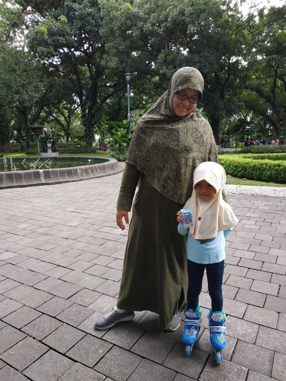 Fahira saat ini sedang semangat belajar sepatu roda, dan kontur taman ini cukup nyaman untuk tempatnya berlatih. Jadilah saya dan suami membagi tugas untuk bergantian jogging mengelilingi taman dan untuk menemani anak-anak di taman yang juga dihiasi oleh patung-patung karya para seniman ASEAN ini.