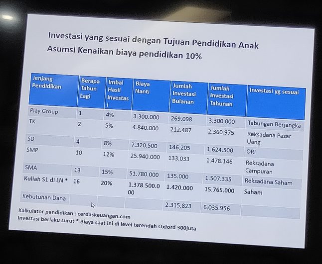 Penting banget ya investasi ini. Saya pun pernah diskusi dengan seorang teman yang bekerja di bidang finance bahwa investasi terbaik itu dimulai 10 tahun lalu, tapi walau telat ya bisa dimulai saat ini juga. Apalagi buat pendidikan anak ya, mengingat anak juga investasi terbesar orang tua untuk dunia dan akhirat. Sekarang saya masih 1 tahun menikah, belum hamil dan tentunya belum ada anak. Tapi sudah kepikiran biaya pendidikan anak hehehe, jadi nabung dan investasi dari sekarang.
