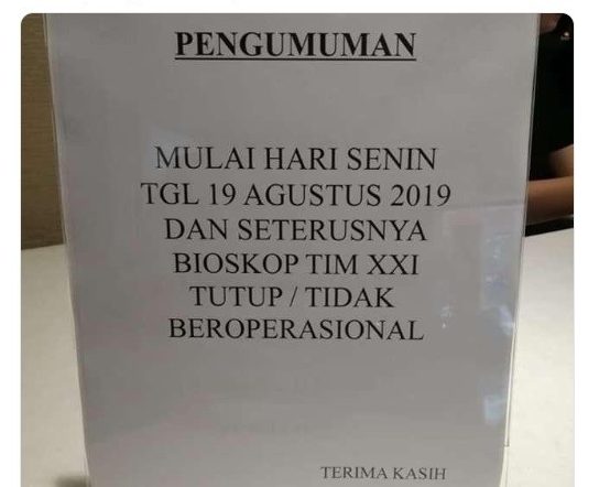 Sehari setelah peringatan hari kemerdekaan, sebuah foto masuk ke grup WhatsApp Mata Sinema Indonesia (MSI) yang saya ikuti. Pak Yan Widjaya rupanya mengirimkan pengumuman akan ditutupnya bioskop TIM XXI mulai tanggal 19 Agustus 2019 dan seterusnya. Saya terkejut membacanya. Wah, padahal TIM XXI yang sesuai namanya berada di dalam kompleks Taman Ismail Marzuki Cikini, Jakarta Pusat ini adalah salah satu bioskop favorit saya karena letaknya yang masih berada di dalam (salah satu alternatif) jalur pulang kantor. Jadi, jika mau nonton tayangan setelah maghrib biasanya masih terkejar setelah jam kerja usai.