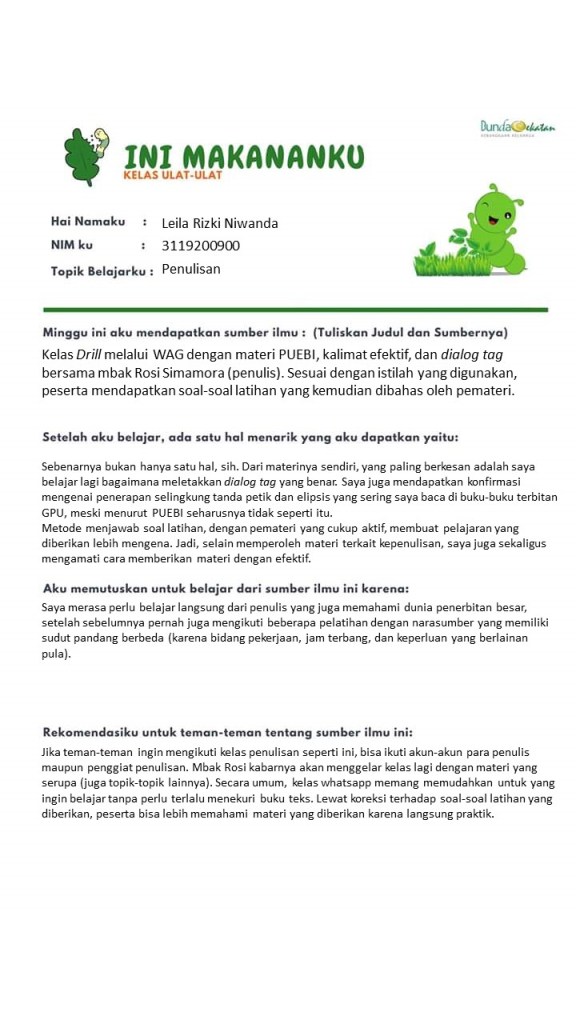 Jadi ceritanya setelah telur-telur kemarin menetas, muncullah ulat-ulat. Apa kerjanya ulat? Makan, tentunya. Namun, ulat yang ini bukan sekadar makan. Para peserta juga diminta menyajikan ilmu yang dipelajari selama sepekan ini untuk bisa dicicipi oleh peserta lainnya. Makanya, jurnal (saya misalnya, membuat dalam bentuk blog ini) baru boleh disetorkan setelah sebelumnya menyajikan “potluck” di grup FB.
