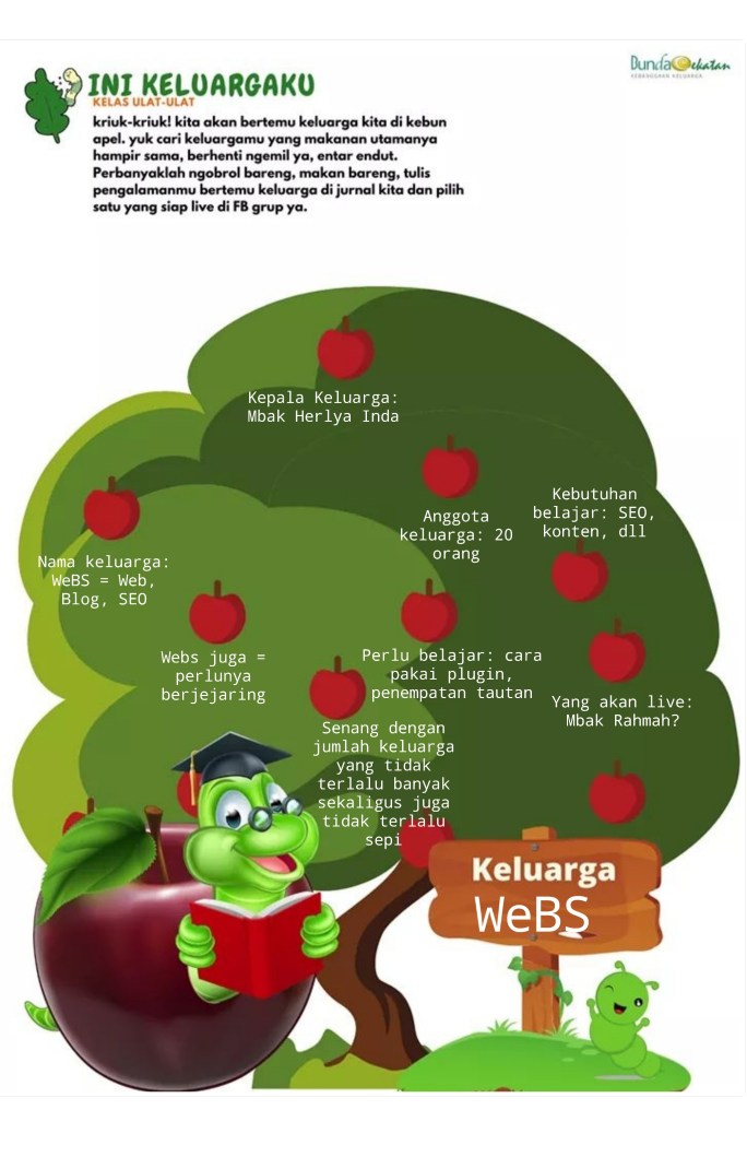 Namun, saya memantapkan diri untuk tetap masuk ke grup keluarga blogging. Toh, katanya ke depannya boleh, kok, pindah keluarga jika memang dirasa perlu. Tepatnya, judul yang diambil oleh grup keluarga yang saya ikuti ini adalah Web-Blog-SEO Family BunCek.