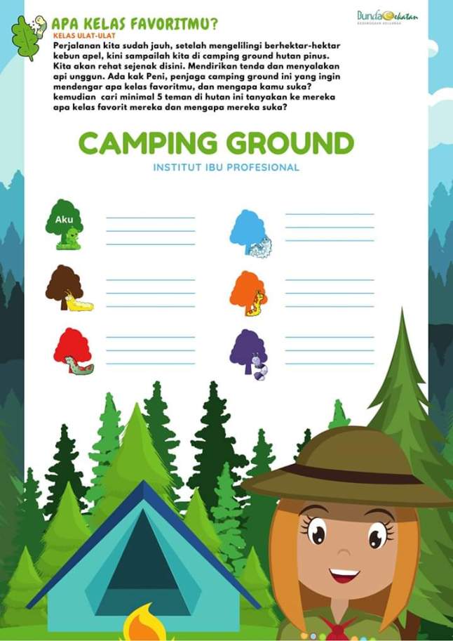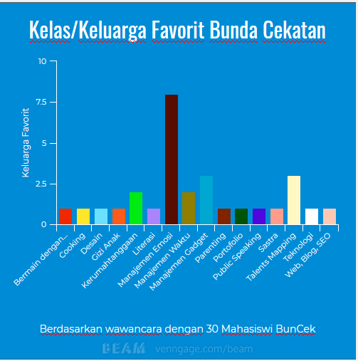 Waktunya cukup terbatas, sejak pemberian tugas hari Jumat ke tenggat akhir hari Selasa sudah harus ada minimal lima teman yang diajak “berkemah bersama”. Teman-teman ini akan digali pendapatnya soal kelas favorit dan alasannya, serta apakah ada tantangan dalam mengikuti kelas tersebut. Kalau bisa, diminta agar teman-teman ini adalah teman-teman baru, bukan yang sudah dikenal sebelumnya. Hasil dari obrolan ini nantinya akan diolah menjadi grafik terkait kelas favorit.