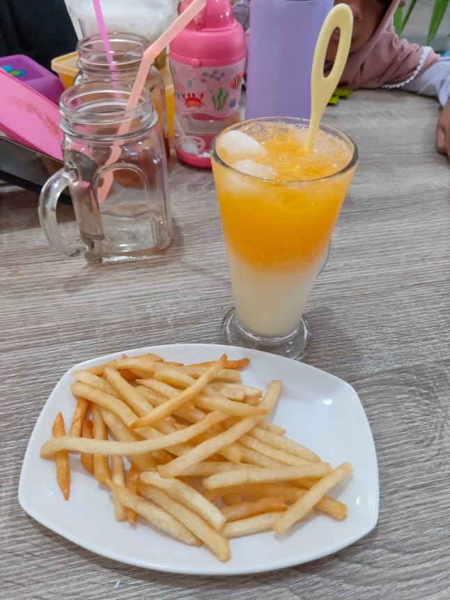 Fasilitas seperti toilet yang bersih, mushalla, dan Wi-Fi gratis pun ada. Parkirannya luas, dengan taman yang asri dipenuhi bebungaan, konon menyesuaikan dengan nama gang tempat gedung BUMN ini berada. Selain sebagai tempat makan dan minum, kafe ini juga sekaligus berfungsi sebagai ruang komunitas. Misalnya, nih, komunitas kita mau bikin acara di sini, kita bisa mengajukan proposal untuk pemakaian ruangan. Ada syaratnya memang, yaitu pembelian makanan di tempat itu dengan minimal jumlah tertentu.