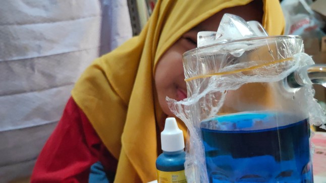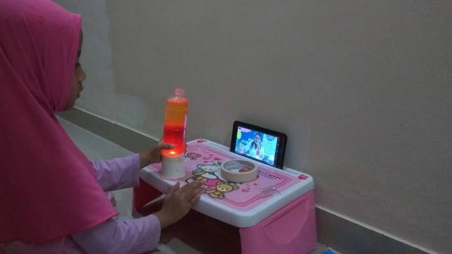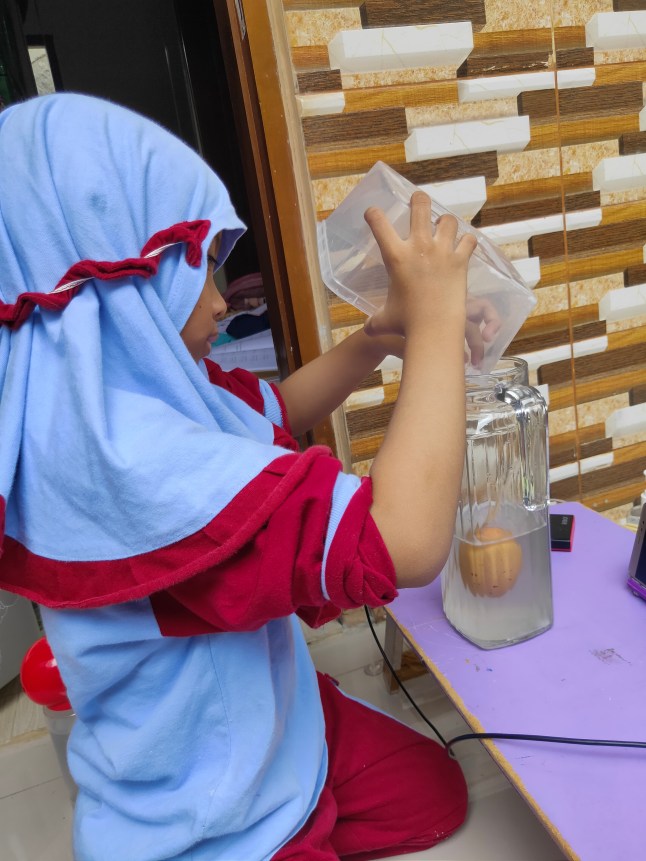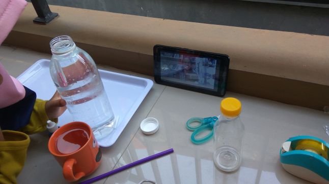 Nah, ini sebagian dari kegiatan yang sempat diikuti oleh anak-anak. Kali ini saya berfokus pada kegiatan berupa dengan eksperimen yang melibatkan air. Selain dari kelas daring yang diselenggarakan oleh pihak lain, ada pula percobaan yang merupakan bagian dari sesi belajar jarak jauh dari sekolah, khususnya sekolah Fahira saat masih TK.