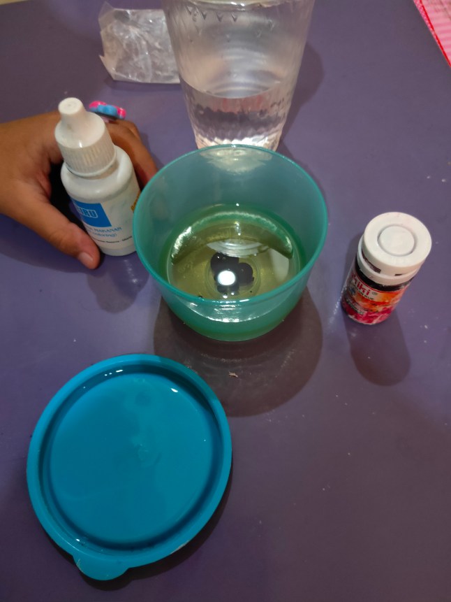 Pasang klip ke badan ubur-ubur, lalu masukkan ke dalam air. Air baru kami beri warna belakangan. Agak tricky memang, karena kalau tidak pas maka ubur-uburnya tidak mau mengapung dan malah tenggelam. Bisa gunakan lebih dari satu klip juga, atur sampai posisi ubur-ubur tidak lagi tenggelam.