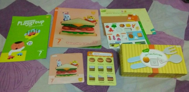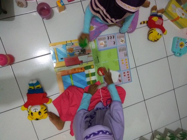 Berhubung Fathia sudah bisa membaca, jadinya dia bisa membimbing adiknya bermain juga. Misalnya dengan membacakan petunjuk permainan.