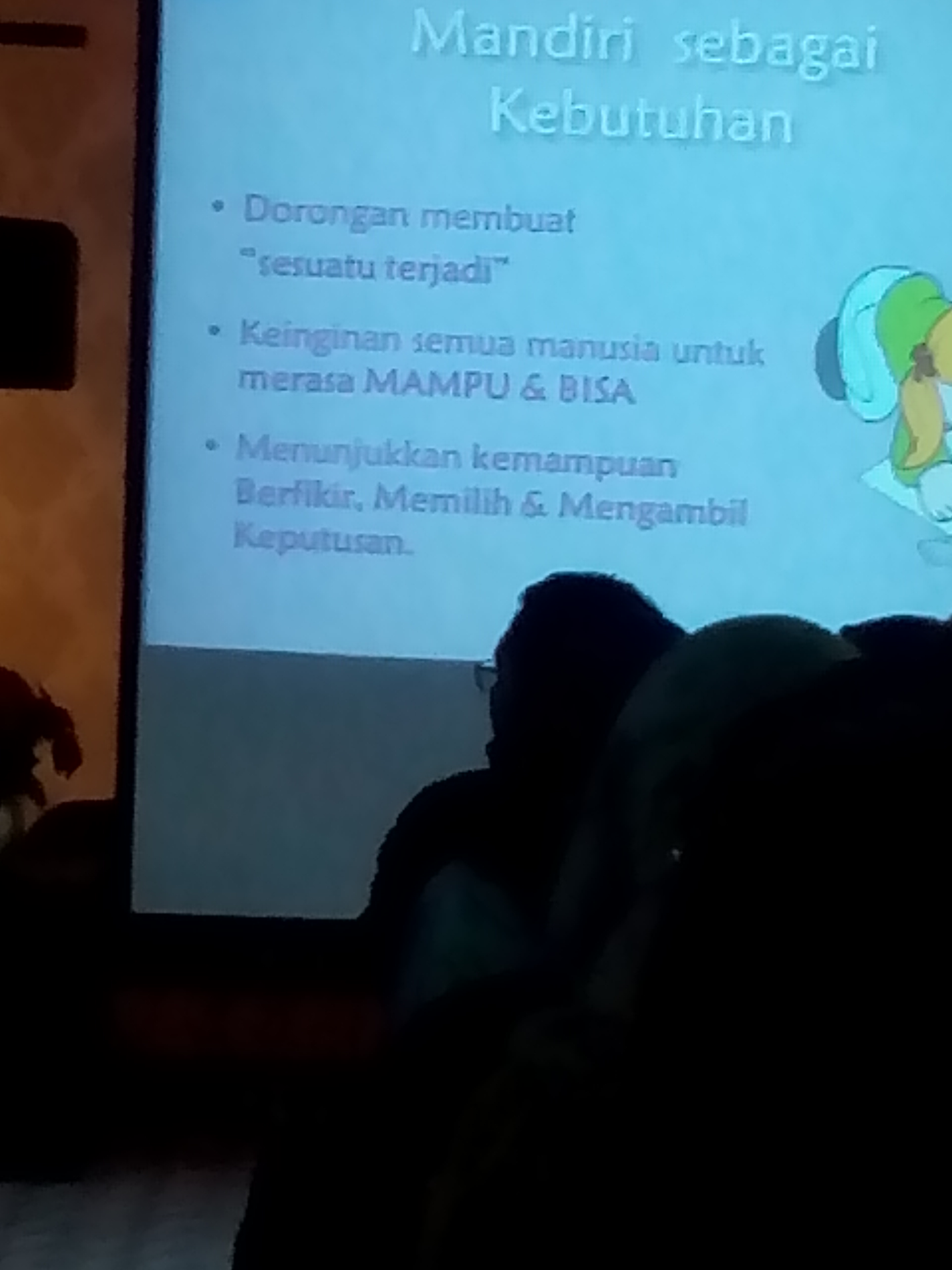 Masalah kemandirian anak: meletakkan barang tidak pada tempatnya, pengaturan waktu antara main, belajar, ibadah, belum mengerjakan tugas rumah…. Ini ada di kuesioner yang dibagikan sebelum sesi kedua dimulai, judulnya masalah, tapi sebetulnya ini tantangan (see…secara common sense kita begitu terburu-buru, padahal usia anak pengisi kuesioner kebanyakan 1-3 tahun).