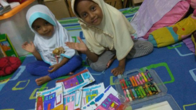 Fathia (5 tahun 10 bulan) sedang suka menggambar rumah. Dua hari yang lalu ia menggambar enam rumah sekaligus, tiga untuknya dan tiga ia bubuhi nama adiknya. Semalam Fathia masih menuntaskan mewarnai gambar rumah untuk Fahira (2 tahun 7 bulan). Kami pun ngobrol tentang jumlah kamar di rumah-rumah yang pernah kami singgahi/tinggali, mulai dari kontrakan, rumah para eyang, sampai rumah keluarga. Berapa totalnya, berapa anggota keluarga di situ dan bagaimana membagi siapa tidur di mana. Kami juga sempat membahas jumlah krayon dengan warna sejenis yang Fathia miliki, kebetulan krayon dari sekolahnya itu (dibawa pulang setelah lulus TK A, sebelumnya disimpan di kelas dan seragam semua murid) jumlah variasi warnanya lumayan banyak sehingga ada yang mirip-mirip juga.