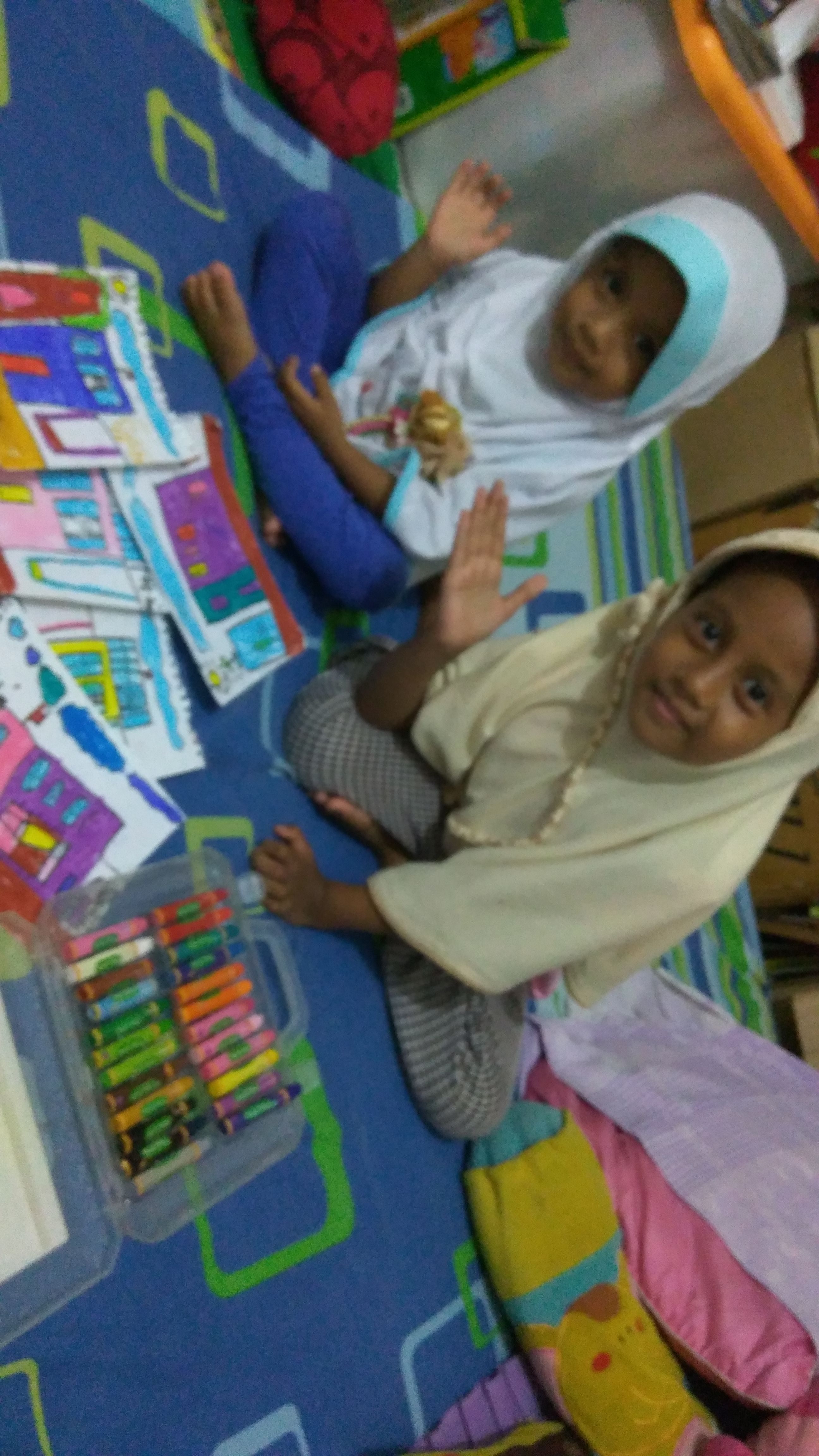 Fathia (5 tahun 10 bulan) sedang suka menggambar rumah. Dua hari yang lalu ia menggambar enam rumah sekaligus, tiga untuknya dan tiga ia bubuhi nama adiknya. Semalam Fathia masih menuntaskan mewarnai gambar rumah untuk Fahira (2 tahun 7 bulan). Kami pun ngobrol tentang jumlah kamar di rumah-rumah yang pernah kami singgahi/tinggali, mulai dari kontrakan, rumah para eyang, sampai rumah keluarga. Berapa totalnya, berapa anggota keluarga di situ dan bagaimana membagi siapa tidur di mana. Kami juga sempat membahas jumlah krayon dengan warna sejenis yang Fathia miliki, kebetulan krayon dari sekolahnya itu (dibawa pulang setelah lulus TK A, sebelumnya disimpan di kelas dan seragam semua murid) jumlah variasi warnanya lumayan banyak sehingga ada yang mirip-mirip juga.