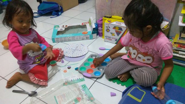 Saya sempat mentok di penjumlahan pengurangan saja, paling-paling variasinya perbandingan ukuran. Padahal sudah ada contoh tentang menimbang dan pengelompokan warna tapi rasanya kok ‘masih kurang matematika’ bagi saya, hehehe. Akhirnya ya lebih banyak menerapkan yang sudah disebutkan di materi (utama maupun cemilan). Malah kadang terjebak juga kegiatannya pakai media yang sudah ada seperti (lagi-lagi) video dan buku yang sudah ada instruksinya jelas, yang mungkin kurang konkret jadinya.