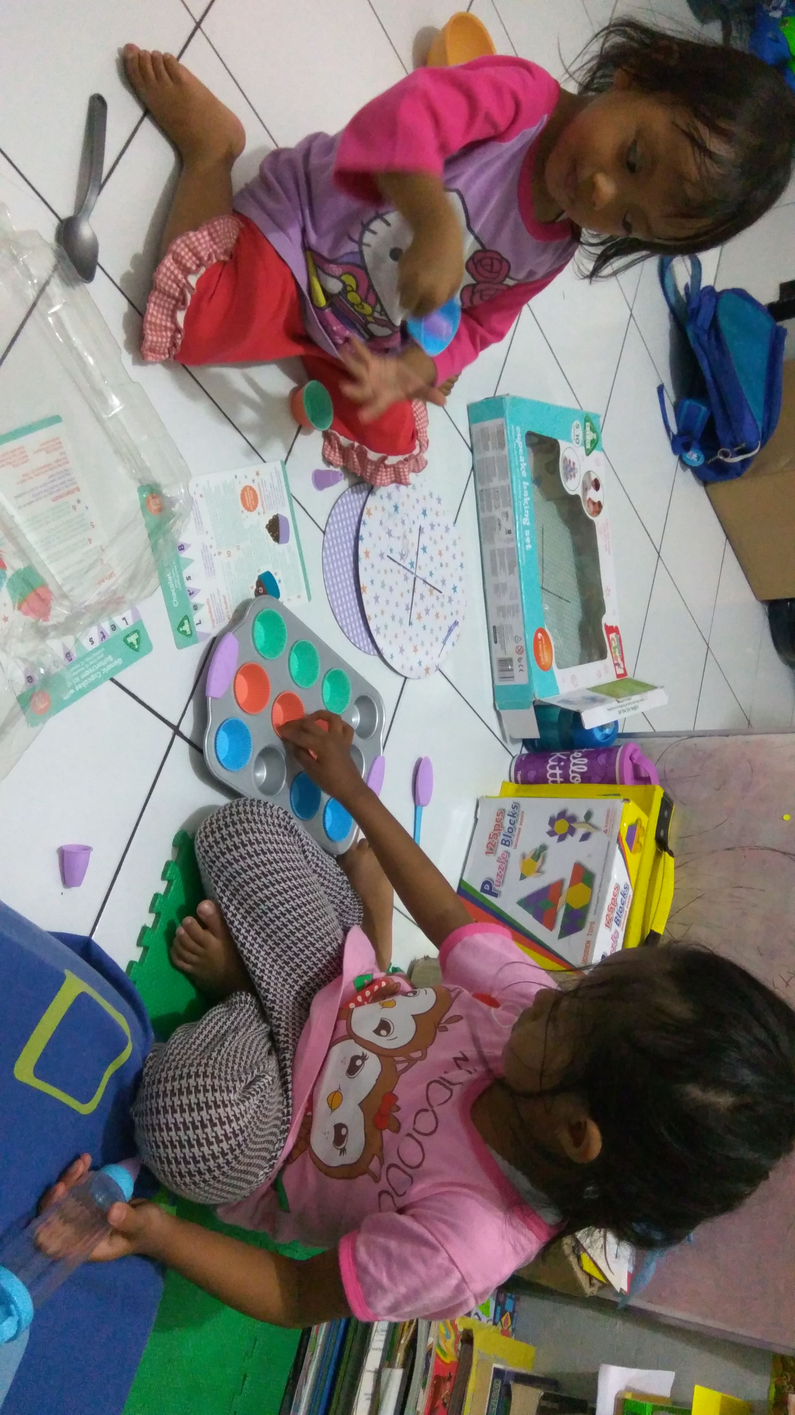 Saya sempat mentok di penjumlahan pengurangan saja, paling-paling variasinya perbandingan ukuran. Padahal sudah ada contoh tentang menimbang dan pengelompokan warna tapi rasanya kok ‘masih kurang matematika’ bagi saya, hehehe. Akhirnya ya lebih banyak menerapkan yang sudah disebutkan di materi (utama maupun cemilan). Malah kadang terjebak juga kegiatannya pakai media yang sudah ada seperti (lagi-lagi) video dan buku yang sudah ada instruksinya jelas, yang mungkin kurang konkret jadinya.